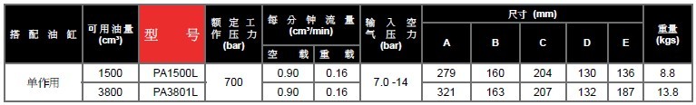 BVA双作用气动液压泵PA1500L 1、高强度铝制铸造油箱重量轻而且不生锈 2、内建溢流阀保护超过负载使用 3、空气工作压力: 110-175 psi / 7-14 bar 4、注油阀有防尘套圈保护避免粉尘进入油箱 5、3公尺手持线控开关可让使用者在安全距离内操作,含可携式手柄 6、最大工作压力: 10,000psi/700bar/70Mpa