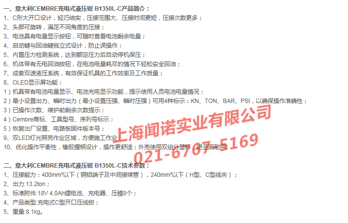 B1350-C|意大利CEMBRE|电动液压钳|B1350-C B1350L-C|意大利CEMBRE|充电式液压钳|B1350L-C B1350-UC|意大利CEMBRE|充电式液压压接钳|B1350-UC B1350L-C-KV|意大利CEMBRE|绝缘液压压接钳|B1350L-C-KV