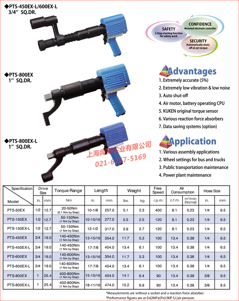 日本KUKEN气动电子定扭矩扳手PTS-800EX规格参数: 1、驱动头尺寸:25.4mm 2、扭矩范围:400-800N.m 3、全长:562mm 4、质量:6.4kg 5、空载转速:90r.p.m. 6、空气消耗量:0.7m³/min. 7、气管尺寸:9.5mm.