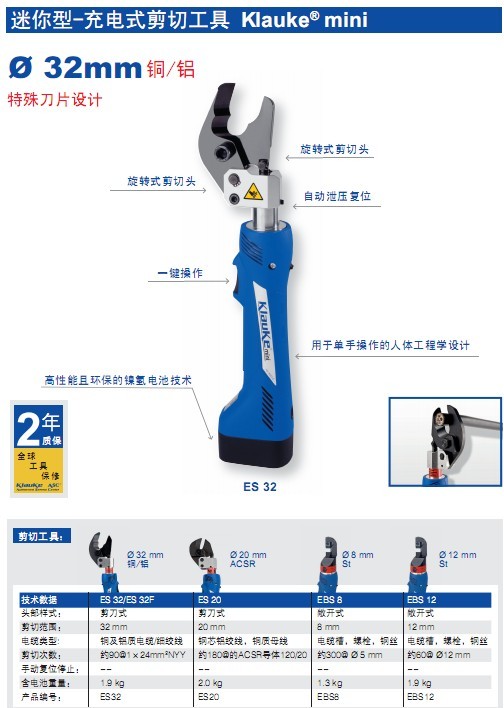 德国KLAUKE|充电式液压切刀|充电式电缆切刀ES32-L
